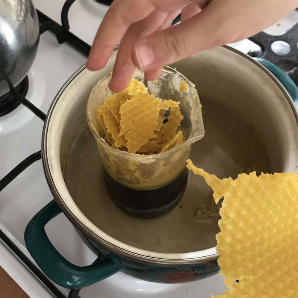 Bizim balmumu eritmek için ısıya dayanıklı ince uzun bir cam kabımız var ama bir teneke ya da başka bir kap da olabilir. Sadece bu iş için ayırabileceğiniz bir kap olmasında fayda var (tencere de dahil!-) çünkü sonrasında balmumunu kaptan temizlemek oldukça zor.